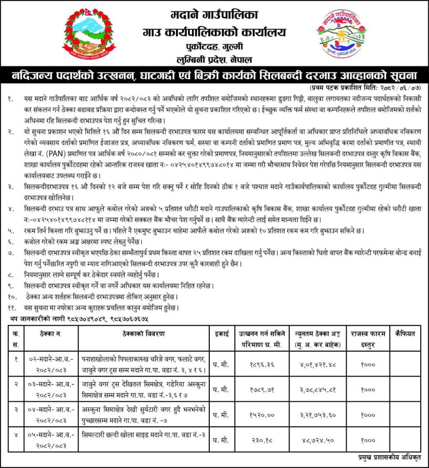 नदिजन्य पदार्थको उत्खन्न घाटद्दी एवं बिक्रि कार्यको सिलबन्दी दरभाउ आव्हान सम्बन्धी सूचना